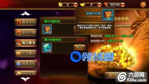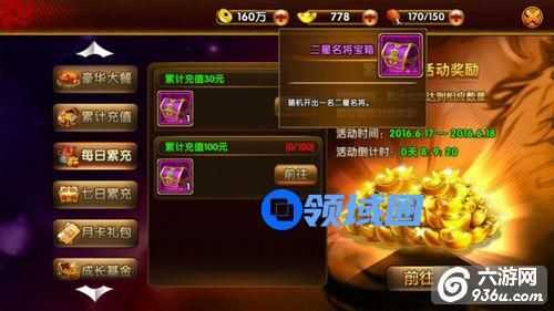 每日充值活动,这个是每两天一次,分为30元/100元两个档次的奖励,分别是一星、二星名将箱子/装备材料、洗练石/宝物精炼石,燎原火。个人建议要充的话就直接100这档了,要么就算了,可以无视。