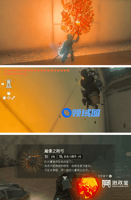 3、用火把燃烧藤蔓,从上方会掉落一个宝箱,打开后获得【魔像之钢弓】。