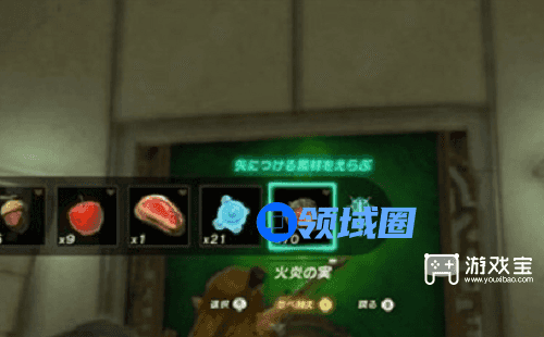 4、进入下个房间拾取火焰果和【残旧的木之弓】,在架好弓的状态下按十字键和右摇杆选择火焰果,将火焰果装在箭上。