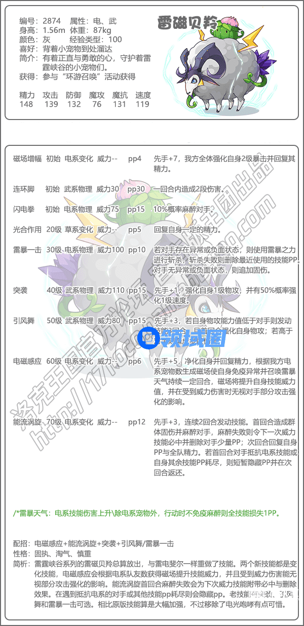 3、简析:雷霆峡谷系列的雷磁贝羚总算放出,与雷电斐尔一样重做了技能。两个新技能都是变化技能,电磁感应会根据电系队友数获得磁场提升技能威力,并且受到威力伤害能无视部分攻击强化的影响。能流涡旋首回合麻醉失败会为下次威力技能附带必中与删除效果。在遇到抵抗电系的对手或其他技能pp耗尽则会隐藏pp。老技能有突袭、引风舞和雷暴一击可选。相比原版技能算是大幅加强,不过移除了电光咆哮有点可惜。
