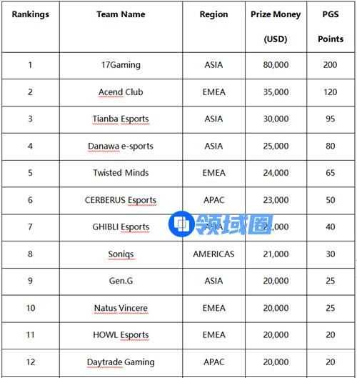 冠军队伍17Gaming获得了80,000美元的奖金。PGS 1的总奖金为50万美元,在24支参赛队伍中进行分配。17Gaming还积累了200个PGS积分。在PGS 1和PGS 2分别产生结果后,PGS积分将根据每场比赛的决赛排名奖励给前16支队伍,累计PGS积分最多的前四支队伍将在年底获得参加PUBG电竞的全球顶级赛事--2023年PUBG全球锦标赛(PGC)的名额。