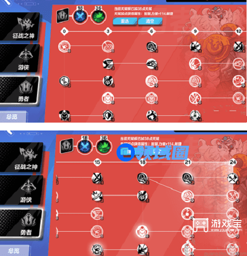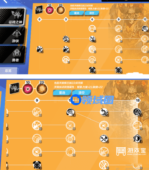 天赋大点:选择【坚强】和【无边战意】。征战之神天赋总共22点,可获得力量与敏捷各22。
