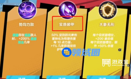 大天赋加点选择【坚毅】以及【实质装甲】这两项,实质装甲可以让收到的元素伤害转化为我们的物理伤害并有几率提高护甲效果。