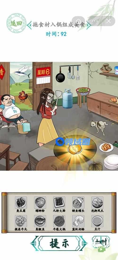 3.九转大肠:把锅台边上的大肠拖到锅里,在把门上的6点一下变成9拖到锅里。
