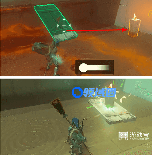 1、进入神庙以后一直往里走,然后在左侧将木板和蜡烛组合在一起。