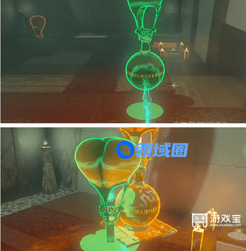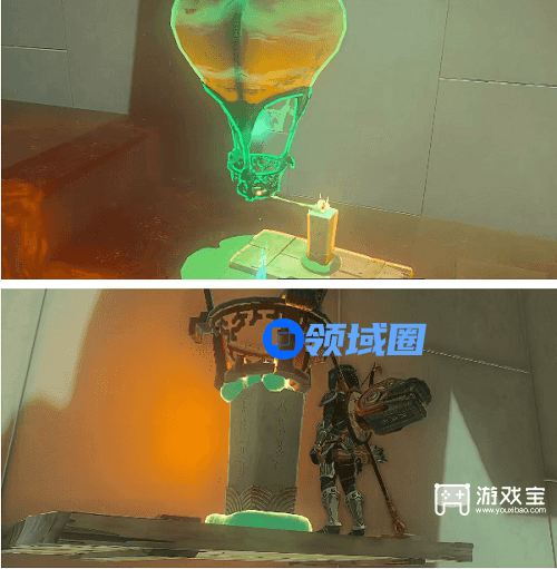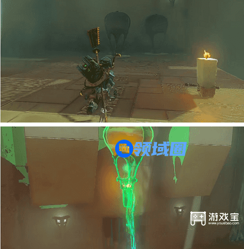 3、来到上一层以后,将下图的热气球与蜡烛组合在一起 ,然后放置到中央大门顶部,等待气球飘上去就能打开大门。