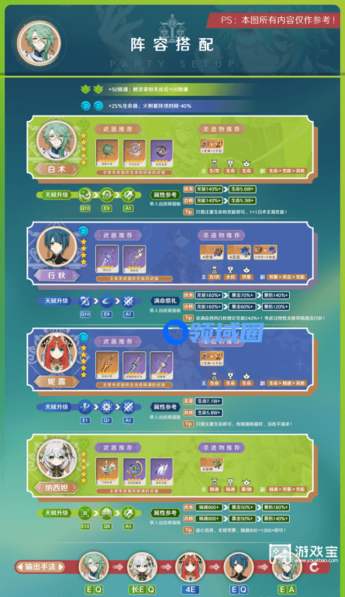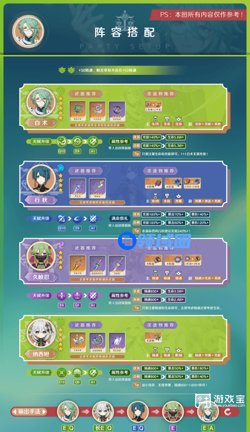 1、纳(草)行久三人自成一体,第四人的选择颇多,而白术进驻该体系更多的标签是“生存拉满”,且白术的A属近战型需“贴脸”才能命中,不担心久岐忍的E超出范围引爆不到草原核,所以适配性挺棒。