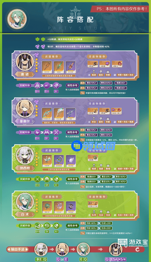 赛诺处于Q状态下是最佳输出状态,一退场就没了,若面对会刷新敌人的环境,无法在赛诺处于Q状态下时切纳西妲出来上蕴种印,而白术虽是单体挂草,但多多少少还是可以弥补一下。双草双雷的共鸣效果对于赛诺而言也是挺适配,回能得到缓解,输出得到提升。白术也确实可解放钟离去第二队。