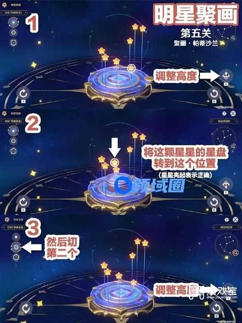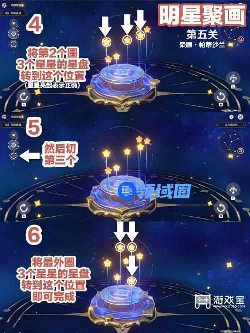 原神明星聚画第五关中,玩家需要通过转动聚画星盘或者调整聚画星盘的高度,完成特定图案后才可以拿到奖励,游戏宝小编带来原神明星聚画第五关攻略,一起来看看吧。