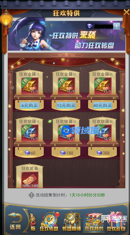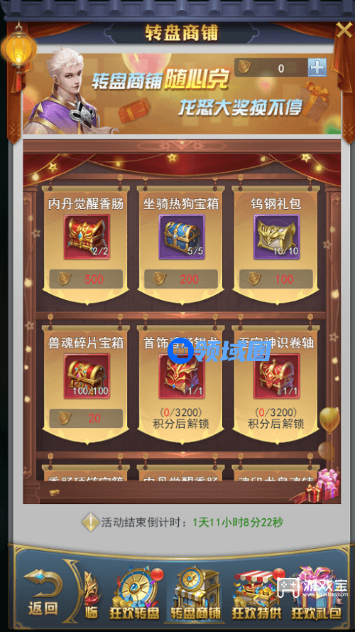 活动期间限时开放转盘商铺,消耗狂欢积分可兑换珍稀奖励。