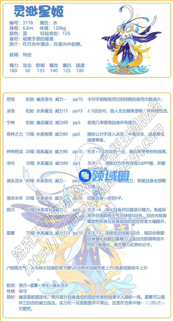 3、简析:幽蓝星姬超进化。朔月提升自身造成的固定伤害的效果令人眼前一亮。星繁可以提供三回合的威力连击。实力在一众宠物里并不突出,还是在仓库中做一只安静的小可爱吧。