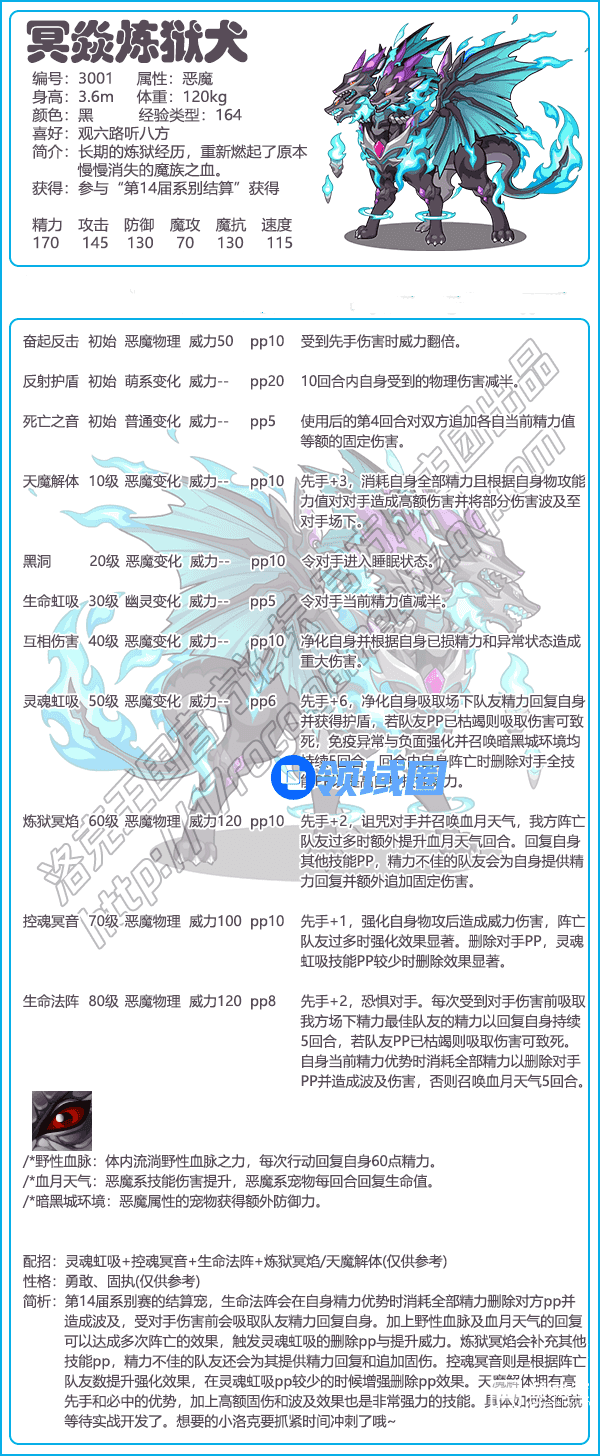 3、简析:第14届系别赛的结算宠,生命法阵会在自身精力优势时消耗全部精力删除对方pp并造成波及,受对手伤害前会吸取队友精力回复自身。加上野性血脉及血月天气的回复可以达成多次阵亡的效果,触发灵魂虹吸的删除pp与提升威力。炼狱冥焰会补充其他技能pp,精力不佳的队友还会为其提供精力回复和追加固伤。控魂冥音则是根据阵亡队友数提升强化效果,在灵魂虹吸pp较少的时候增强删除pp效果。天魔解体拥有高先手和必中的优势,加上高额固伤和波及效果也是非常强力的技能。具体如何搭配就等待实战开发了。