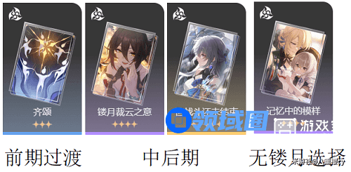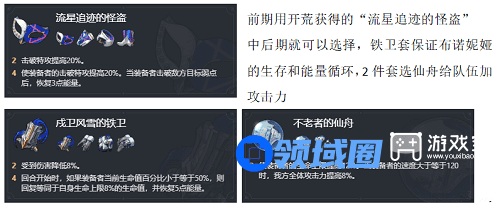 2、前期用开荒获得的“流星追迹的怪盗”中后期就可以选择,铁卫套保证布诺妮娅的生存和能量循环,2件套选仙舟给队伍加攻击力