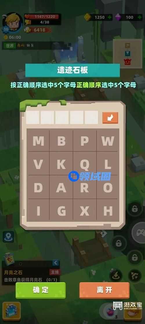 3、按正确顺序选中5个字母正确顺序选中5个字母后在输入点击确定即可解开石板了。