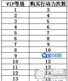 剑阁的行动力和战力是至关重要的,这2个多数是个VIP等级有关的。所以附上各vip等级可购买行动力次数。(5体力是40元宝)