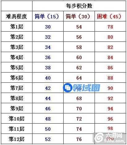 首先看剑阁的3个难度,直接和等级相关。下面是小编统计的每个难度每走一步奖励的积分数图表。