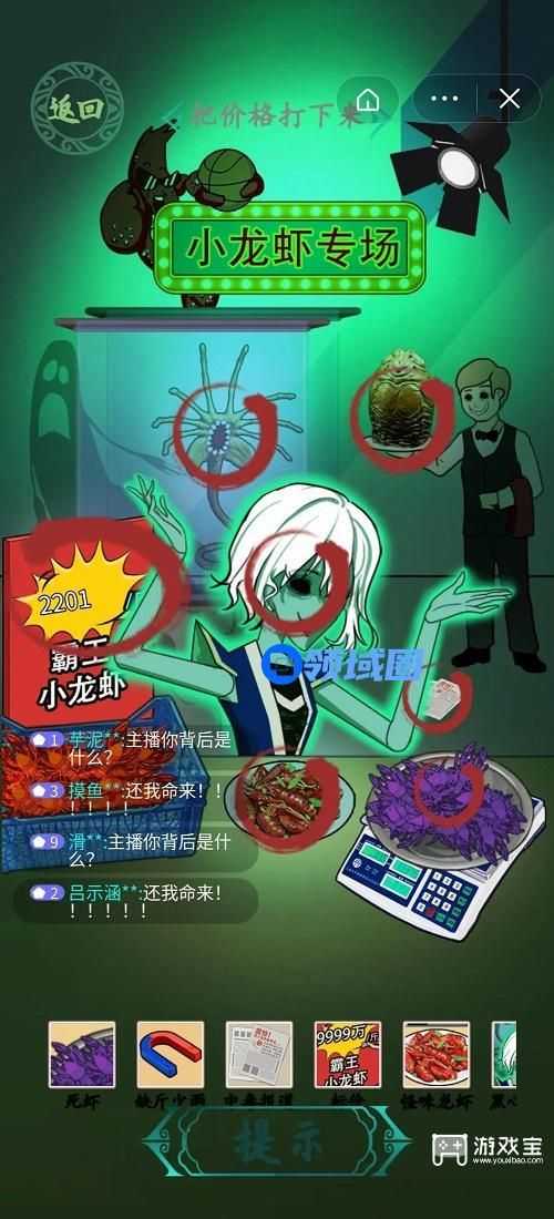 3、点击电子秤,下方磁铁,缺斤少两;拖动盘子里小龙虾给主播吃,吐了,怪味小龙虾;
