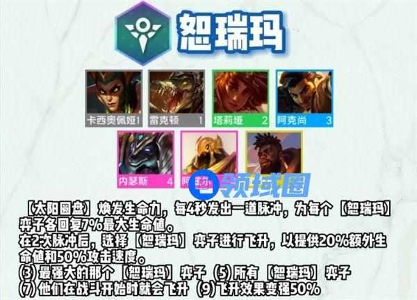 云顶之弈S9恕瑞玛的羁绊效果还是很强大的,可以帮助玩家更好地为获得游戏胜利,在太阳圆盘上燃放自己的生命力,每4秒可以发出一道脉冲,【恕瑞玛】的弈子们各回复7%的生命值,2次脉冲之后选择【恕瑞玛】弈子可以进行飞升,效果还会增强。