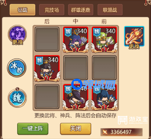 2、组合说明:以司马懿拥有群体伤害附带“冰冻”效果能力的输出性武将搭配贾诩能提高“冰冻”效果触发率与提高“冰冻效果伤害率能力的半辅助半输出性武将为核心来组建全魏国阵营队!