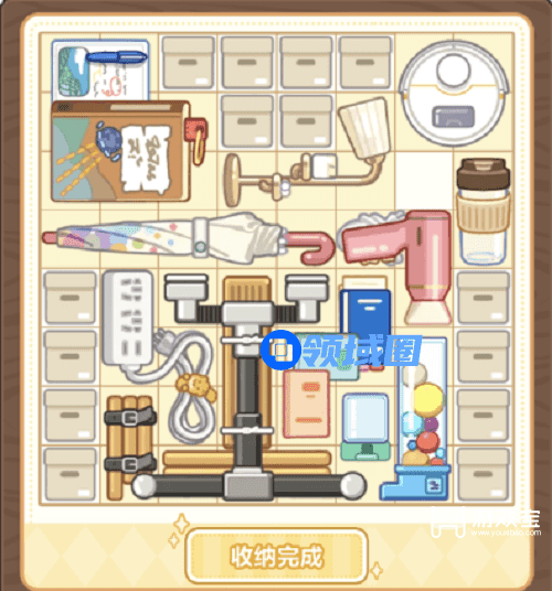 2、不知道怎么收纳的可以参考上面的图,把各个物件都放入指定的位置后就可以过关了。