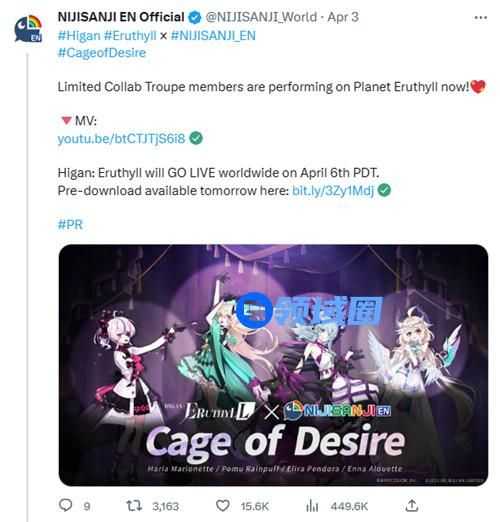 待公测上线之前,《依露希尔:星晓》还与海外人气虚拟主播团体彩虹社EN合作,以“依露希尔联动限定歌剧团身份”,打造了“彩虹社EN史上首支跨组合原创曲”——Cage of Desire,获得了巨大成功。