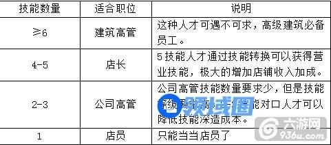 选好培养员工之后,就可以开展我们的员工培养计划了。对于已经获得技能的员工,要提前安排好他们的岗位,针对性的进行技能深造和技能转换。员工一共有10种职业技能和5种营业技能,其中营业技能只能通过技能转换获得。