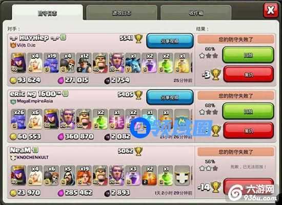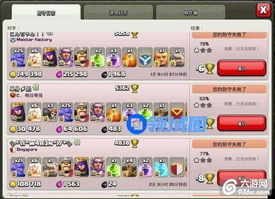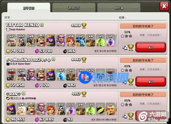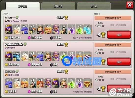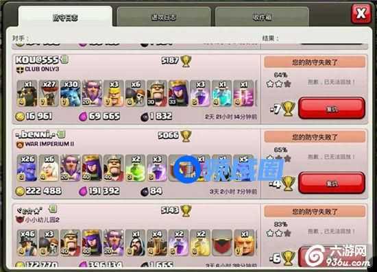 阵型也是本人慢慢改过来的回字阵。基本上没有防御成功过,不过如图所示,绝大多数时候都是被打一颗星。特地拿来和大家分享下,助还在冲传奇杯的一臂之力。