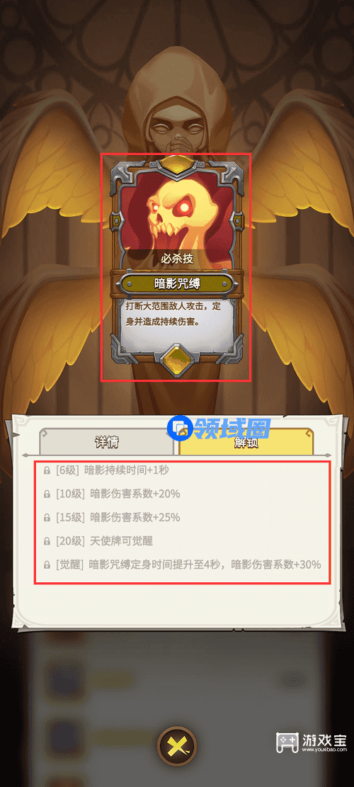 1、猎魔人的天使牌搭配可选择的余地较多,由于目前放出的必杀技和守护技只有两个,因此这两个天使牌没有悬念,必杀技选择暗影咒缚,可打断大范围敌人攻击,定身敌人并造成持续伤害;守护技选择暗影迷踪,可以大幅降低受到的伤害,并提升移动速度。一控制,一防守,配合攻击力强悍的猎魔人,如虎添翼。(想要完全上手需要多次练习才行)