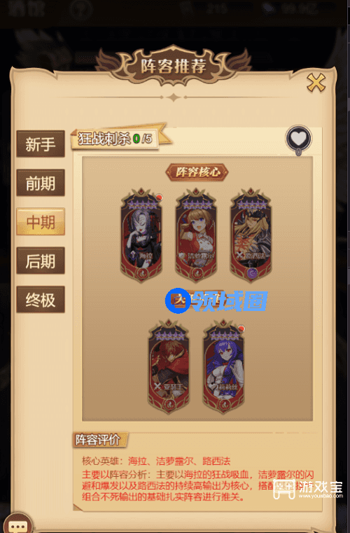 1、以海拉、洁萝露尔、路西法为核心输出的狂战刺杀阵容,主要以海拉的狂战吸血,洁萝露尔的闪避和爆发以及路西法的持续高输出为核心。