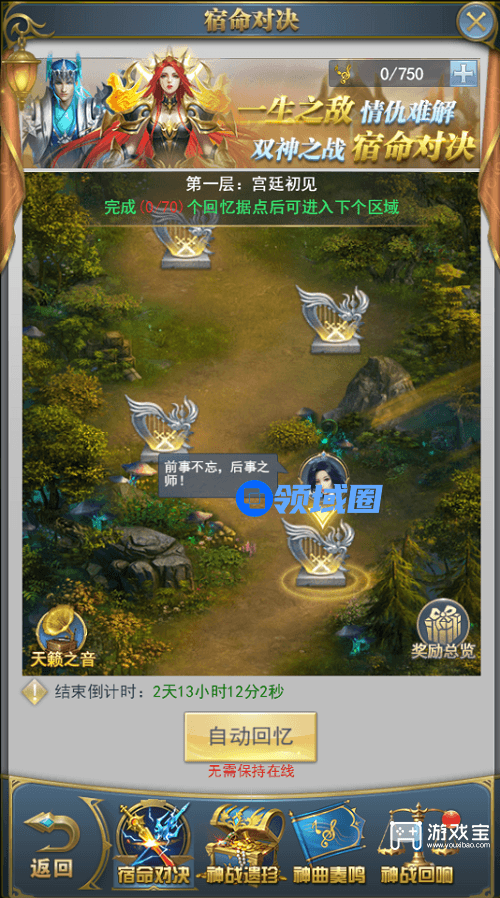 宿命对决分为五层考验,每层共有若干个回忆点,完成该层所有回忆据点可进入下一层,回忆层数越高,则掉落的奖励越好!