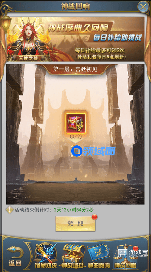 每日神战回响最多领取2次,每次补给有时间间隔,领取当前补给7小时之后才可领取下一补给。