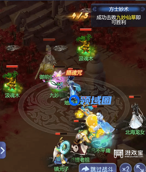 1、打法思路:开场4个怪,1个御前侍卫隐身,2个汲魂木受到伤害后,立即对所有敌方单位发动1次攻击,其中击败九妙仙草即为通过。