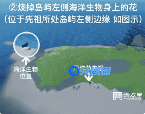 2、烧掉岛屿左侧海洋生物身上的花(位于先祖所处岛屿左侧边缘)。