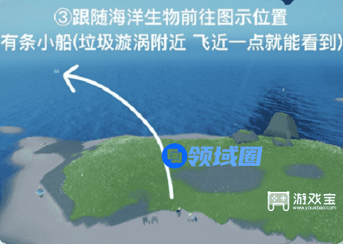3、跟随海洋生物前往图示位置,有条小船(垃圾漩涡附近,飞近一点就能看到)。