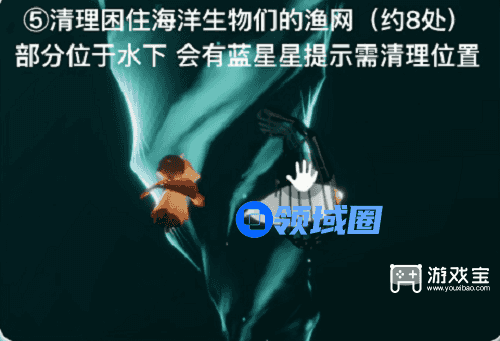 5、清理困住海洋生物们的渔网(约8处)部分位于水下,会有蓝星星提示需清理位置。