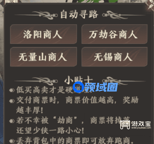 点开可以看到一共有4个地图和4个商人,分别是洛阳,万劫谷,无量山,无锡。