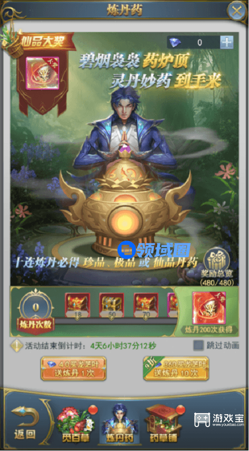 活动期间,可消耗“药草”或使用钻石购买龙芝叶进行炼丹,随机获得凡品丹药、珍品丹药、极品丹药、仙品丹药大奖4种品质的炼丹奖励