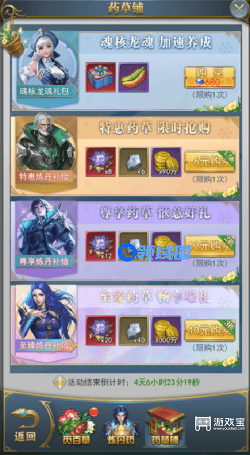 活动期间可购买药草礼包,助力炼丹!每种礼包仅限购买一次,不要错过噢!