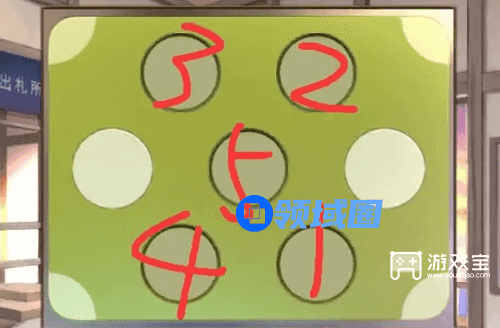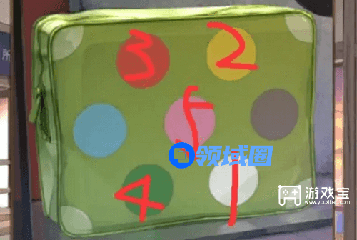 谜底是屋外牌子的五个字,用车票对应的小球按包上的颜色顺序排列,按这个顺序解锁