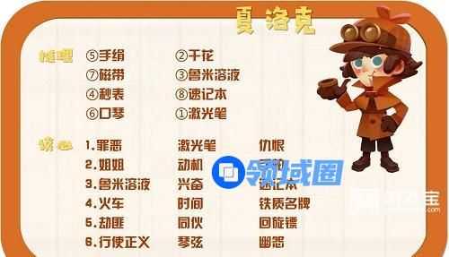 1、推理:激光笔、干花、鲁米溶液、秒表、手绢、口琴、磁带、速记本。