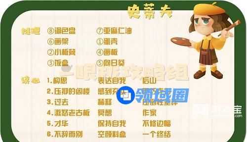 1、推理:蛋壳、小板凳、饭盒、画板、向日葵、画架、亚麻仁油、调色板。