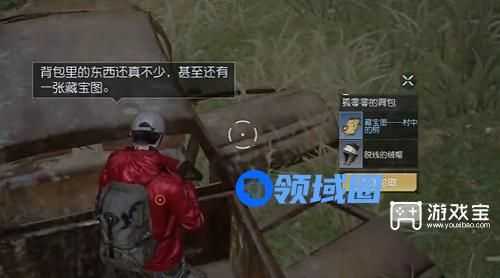 2、看到废弃的车辆到达车子的上方,翻出孤零零的背包,找到藏宝图,发现藏宝的位置。
