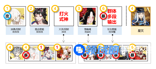 5、备注:帝释天保证全队最高攻击;绘卷隐念歌姬攻攻攻,全程可用,如果没有就根据当下战斗时敌方血量情况延用以前的破势歌姬(70%以上血量时)、心眼歌姬(70%以下血量时),除了中途要换一次御魂其他没啥大的影响;打火式神用d流光追月神最优(自带驱散),用千姬和追月需要队伍一速;清姬和输出可以用任意两个多段群体输出替换,御魂都用针女歌姬,如果输出用铃彦姬,流光追月神御魂建议携带防防防钓瓶火,如果用月读,月球可以防一手魅妖。