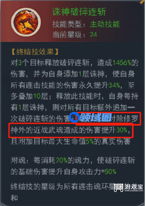 诛神是群体技能,基础伤害不高,主打的是叠层以后的伤害永久提升,利用追加的次数打伤害,这个技能很吃冷却缩减,对近战武魂有额外伤害,附魂有额外伤害加成。