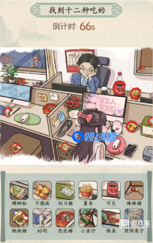 4、可以看到这个盆栽俩边都是吃点,左边是小鱼仔右边是辣条,最后拉开窗帘,可以看到外面的小姐姐手中拿着煎饼果子,那么十二种食物找完。