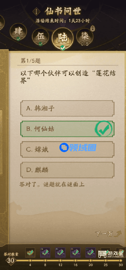 神仙道3仙书问世第六天一共五个题目,玩家全部答对后即可领取30累计奖励,游戏宝小编带来神仙道3仙书问世第六天答案,一起来看看吧。