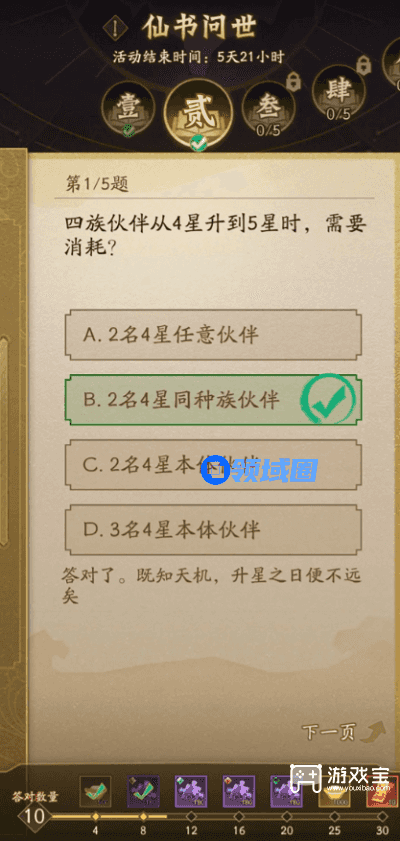 神仙道3仙书问世第二天一共五个题目,玩家回答正确后即可领取4、8的累计奖励,游戏宝小编带来神仙道3仙书问世第二天答案,希望可以帮到大家。