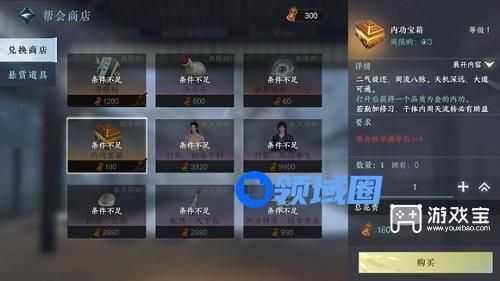2、第二个是帮会系统里的帮会商店,当帮会等级达到4级的时候商店就会解锁金色心法的购买权限,每周最多可以买3件。所以“找棵大树好乘凉”也没啥毛病。