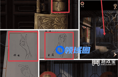 14.(院子-左)点击房间门上的密码锁,根据书上的手势线索和灯笼上的文字顺序(拂云、垂露、怒发、浮香),转动图案至正确位置,打开房门