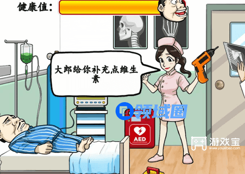 1、进入游戏是护士要打针,拖动针给护士右手,大郎不打,拖动电钻到护士左手,大郎打了、